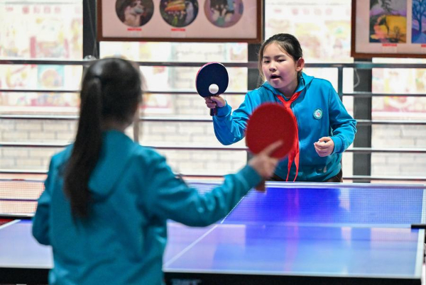 图为在新疆乌鲁木齐市第一小学,学生在体育课上练习乒乓球(2月24日摄)。新华社记者 丁磊 摄