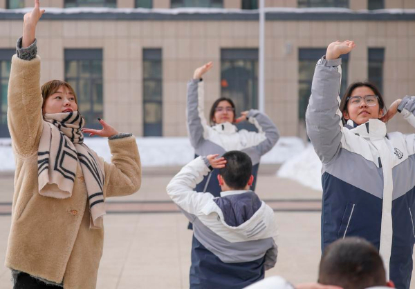 图为在新疆乌鲁木齐市第一中学,老师指导学生在大课间做民族舞健身操(2月20日摄)。新华社记者 王菲 摄