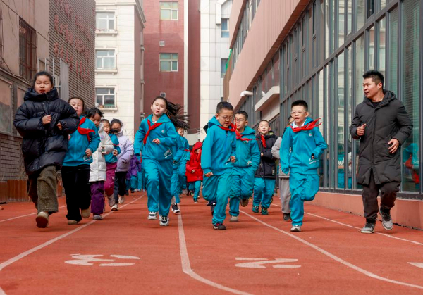 图为在新疆乌鲁木齐市第一小学,学生在体育课上跑步(2月20日摄)。新华社记者 王菲 摄