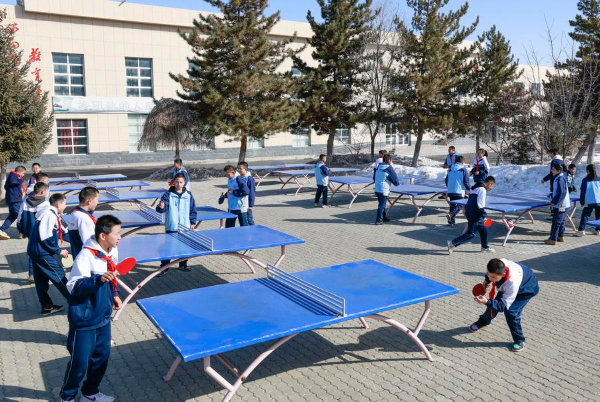 图为在新疆乌鲁木齐县第一中学,学生们在体育课上打乒乓球(2月21日摄)。新华社记者 王菲 摄