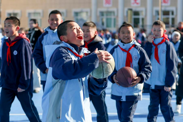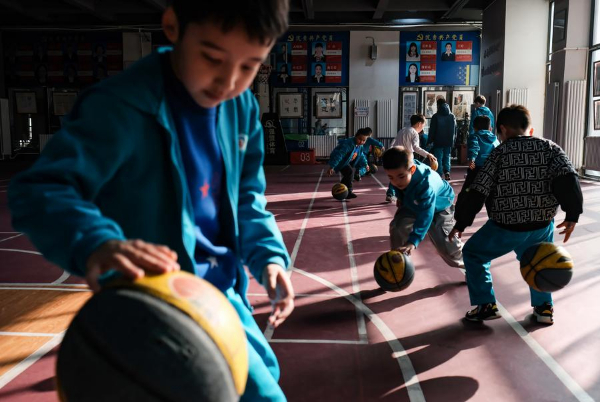 图为在新疆乌鲁木齐县第一中学小学部,学生在大课间打篮球(2月21日摄)。新华社记者 王菲 摄