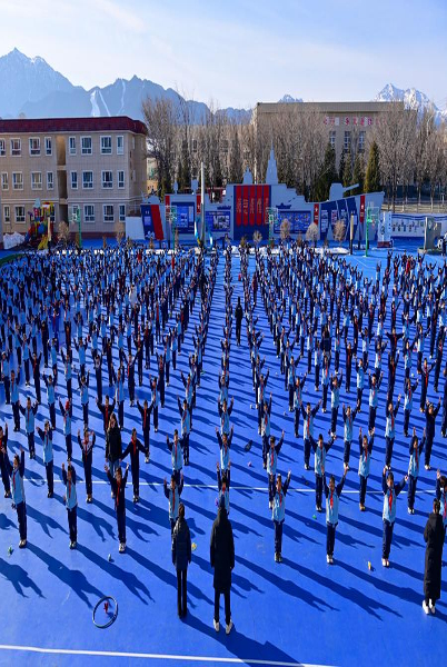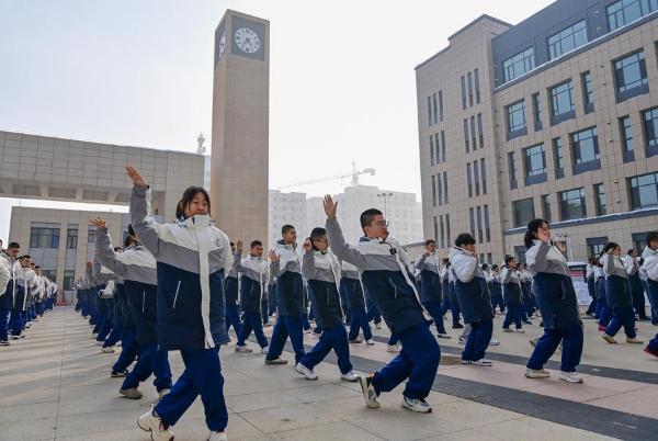 图为在新疆乌鲁木齐市第一中学,学生在大课间做民族舞健身操(2月19日摄)。新华社记者 丁磊 摄