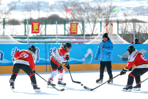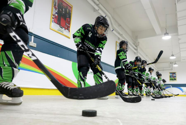 图为在新疆乌鲁木齐县第一中学,学校冰球队队员在体育课上训练(2月21日摄)。新华社记者 丁磊 摄