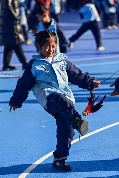 图为在新疆乌鲁木齐县第一中学小学部,学生在大课间踢毽子(2月21日摄)。新华社记者 丁磊 摄