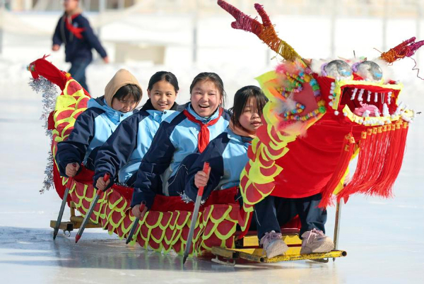 图为在新疆乌鲁木齐县第一中学,学生们在体育课上进行冰上龙舟赛(2月21日摄)。新华社记者 王菲 摄