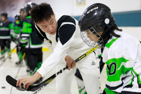 图为在新疆教育学院实验小学,体育老师在体育课上指导学生练习冰球(2月20日摄)。新华社记者 王菲 摄