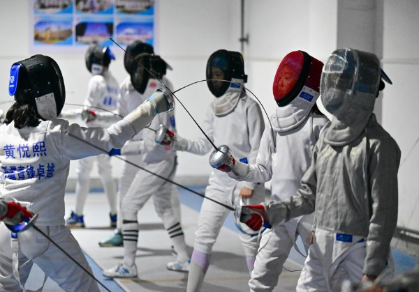 图为在新疆乌鲁木齐市第一小学,学生在体育课上练习击剑(2月24日摄)。新华社记者 丁磊 摄