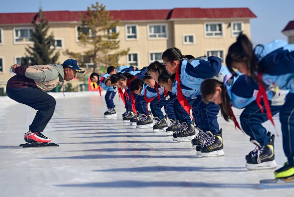图为在新疆乌鲁木齐县第一中学,学生们在上速度滑冰课(2月21日摄)。 新华社记者 丁磊 摄