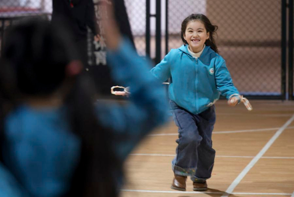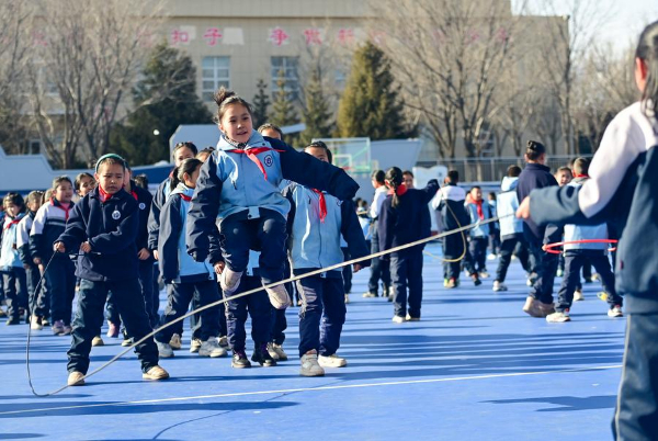 图为在新疆乌鲁木齐县第一中学小学部,学生在大课间跳绳(2月21日摄)。新华社记者 丁磊 摄