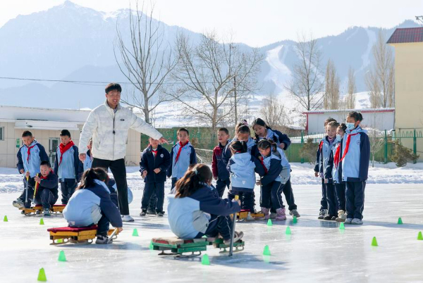 图为在新疆乌鲁木齐县第一中学,学生在体育课上练习冰爬犁(2月21日摄)。新华社记者 王菲 摄