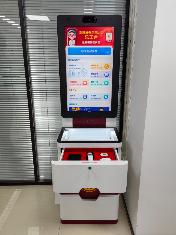 工商银行喀什分行营业部工会驿站在原有基础上,进行了功能升级,除了提供休息、饮水、热饭、充电、擦鞋、雨伞、报刊、药箱等基本服务外,增设了远程视频医务室,为户外劳动者提供更为全面的医疗服务。该“远程视频医务室”配备了先进的智能医疗终端设备和配套设施,具有多元化服务功能。