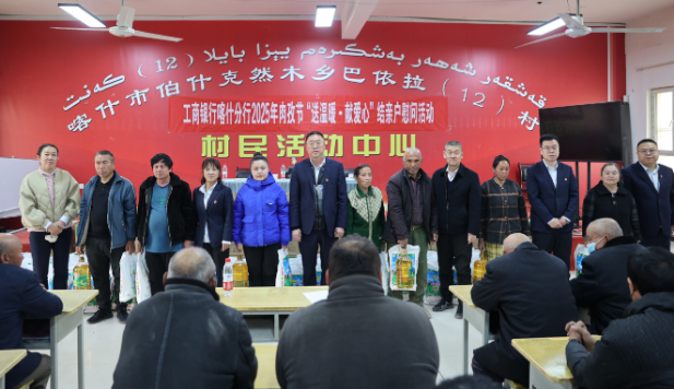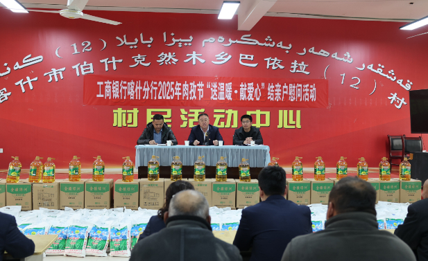2025年3月27日,工商银行喀什分行作为后盾单位,在驻村点——喀什市伯什克然木乡巴依拉12村村委会大礼堂,举行了工商银行喀什分行2025年“送温暖·献爱心”结亲户慰问和宣传活动,工商银行喀什分行领导班子成员、干部员工、驻村工作队成员,伯什克然木乡党委、乡政府领导、巴依拉12村干部、结亲户村民近150人参加。