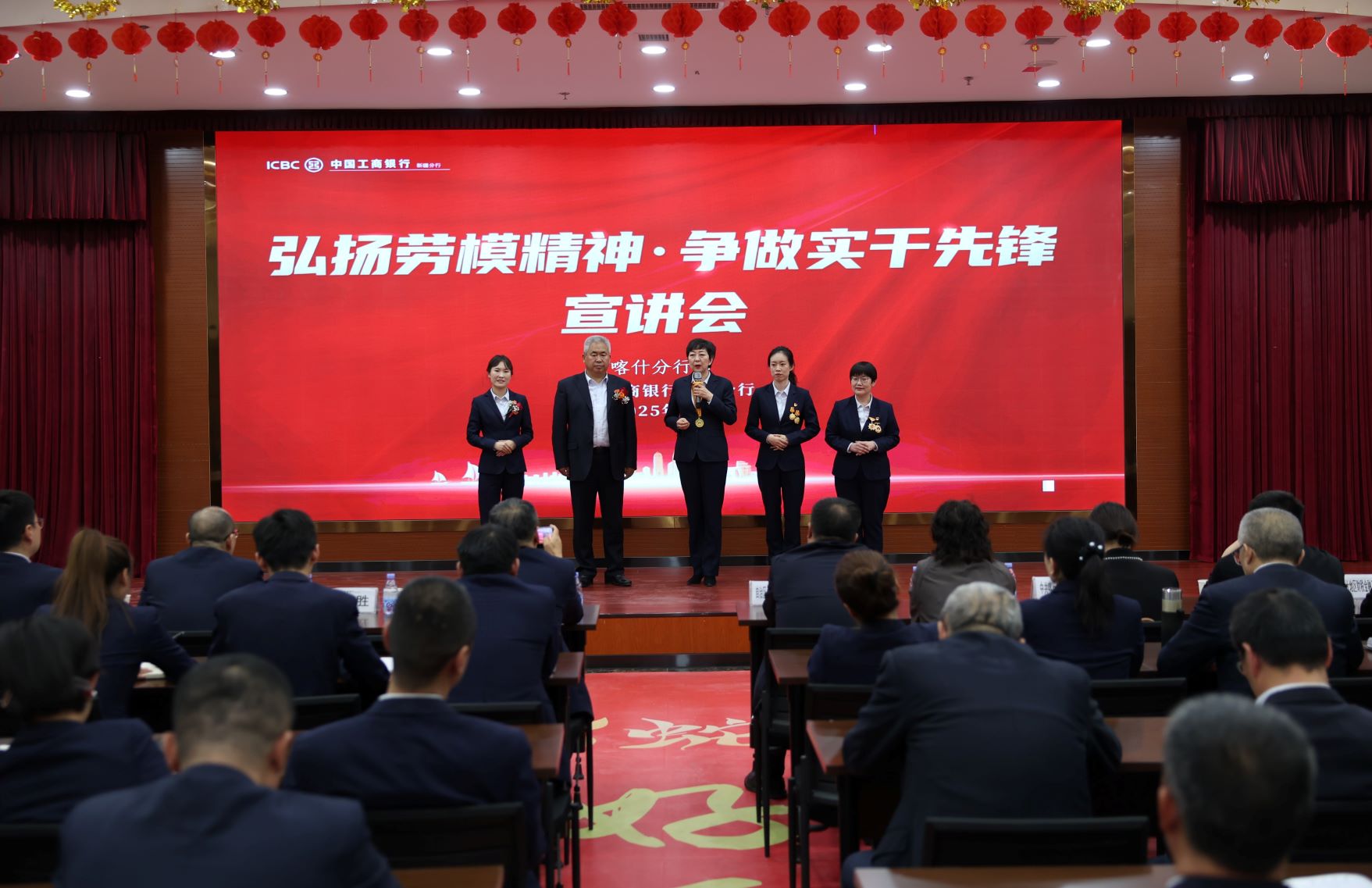 2025年4月14日下午,工商银行新疆分行开展第二轮“弘扬劳模精神争做实干先锋”先进典型代表在工商银行喀什分行的宣讲,这是一场传承精神,凝聚力量,用劳模精神照亮工商银行喀什喀什分行新征程的盛会。党的十九大、二十大党代表李鹏,全国金融五一奖章获得者李静、彭云朗,中国工商银行第五届“感动工行”人物姜红光,以及中国工商银行“为军服务十佳”网点——中国工商银行新疆和田皮山赛图拉支行代言人方丽娜,五位先进典型代表用她们的亲身经历和感人故事,为工商银行喀什分行与会者描绘了一幅幅生动的奋斗画卷。不仅是对新时代劳动者风采的一次深情礼赞,更是对喀什分行全体员工的一次精神洗礼和奋斗动员,传递“爱岗敬业、争创一流,艰苦奋斗、勇于创新,淡泊名利、甘于奉献”的精神力量,激励工商银行喀什分行每一位员工。