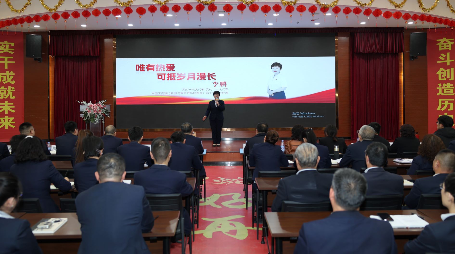 党的十九大、二十大代表、全国优秀共产党员、全国劳动模范、全国五一劳动奖章、全国金融道德模范、全国三八红旗手、全国无偿献血奉献金奖、中国工商银行第四届“感动工行”员工、中国工商银行第一届“大行工匠”,工商银行乌鲁木齐新民路支行营业室高级经理李鹏,作为工商银行新疆分行的杰出代表,肩负着党和人民的重托,始终坚守在金融服务的第一线。在宣讲中,李鹏同志以“唯有热爱可抵岁月漫长”为主题,分享了自己作为一名党代表的成长历程与心路历程。三十五载基层坚守,从默默服务客户到成立金融工作室,从指尖上的信任到病床边的托付,从民族团结到无偿献血。一路走来,她将个人精神升华为集体精神,引领更多工行人不断向前。她始终牢记党代表的职责使命,积极为金融改革与发展建言献策。