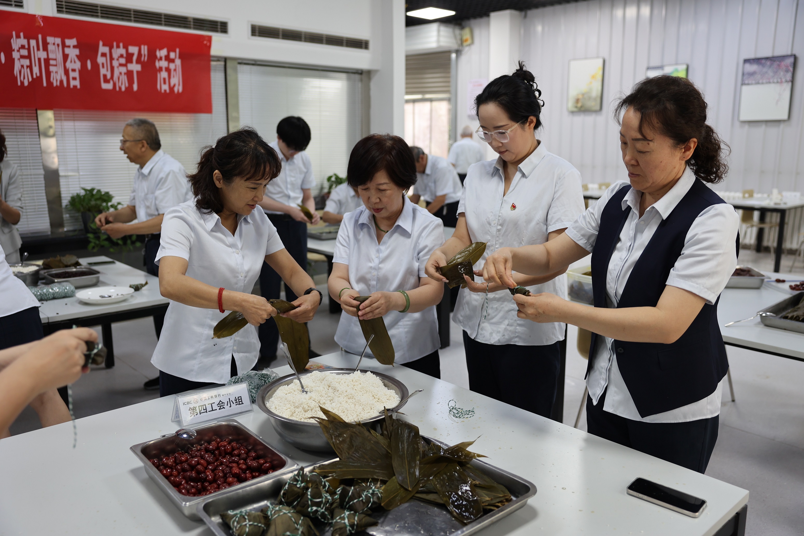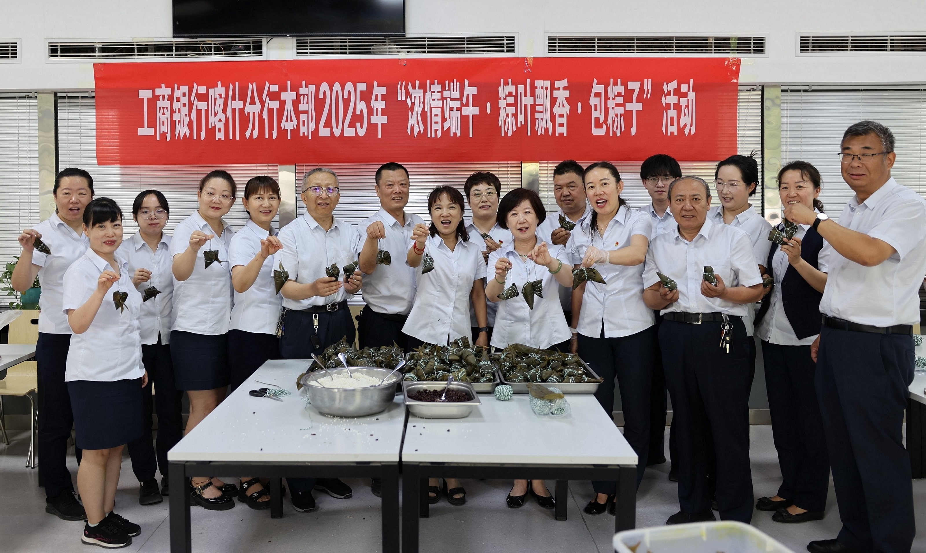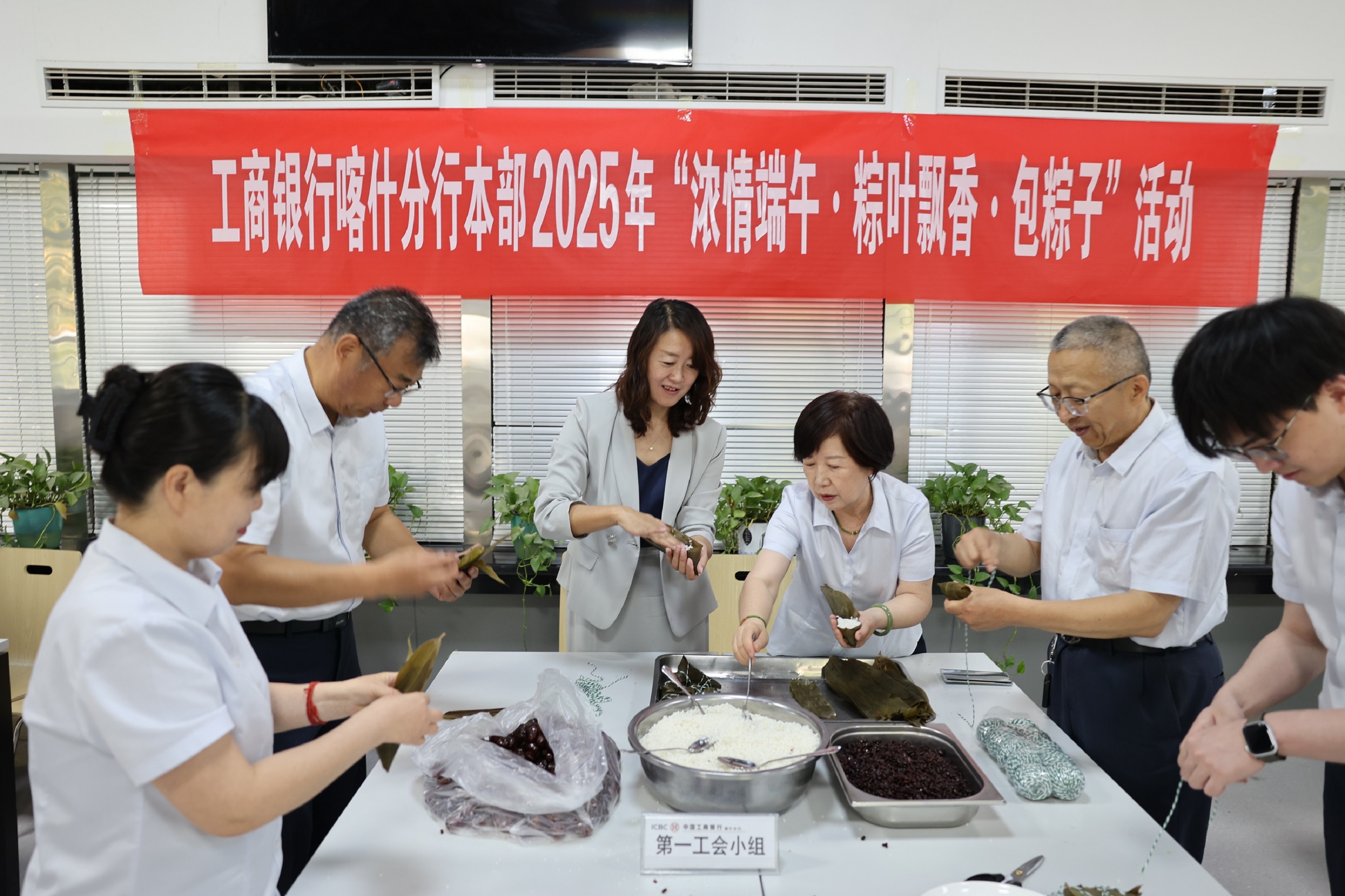 端午节,又称龙舟节、重午节、五月节等,是充满中华民族传统文化气息的重要节日之一。2025年“端午节”前夕,为了深入贯彻落实工商银行总分行党委“快乐工作、健康生活”的理念,进一步丰富员工生活,增进员工之间感情,缓解工作压力,营造温馨和谐的节日氛围,5月28日上午,工商银行喀什分行工会精心策划,组织本部6个工会小组在本部职工食堂开展了一场别开生面的“浓情端午·粽叶飘香·包粽子”活动,喀什分行党委书记许娟,党委委员、副行长、工会主席杨卫华,行长助理赵伟以及各工会小组选派的员工参加了活动,行领导同员工们一起在粽叶飘香、糯米成粽的欢乐中共度佳节。