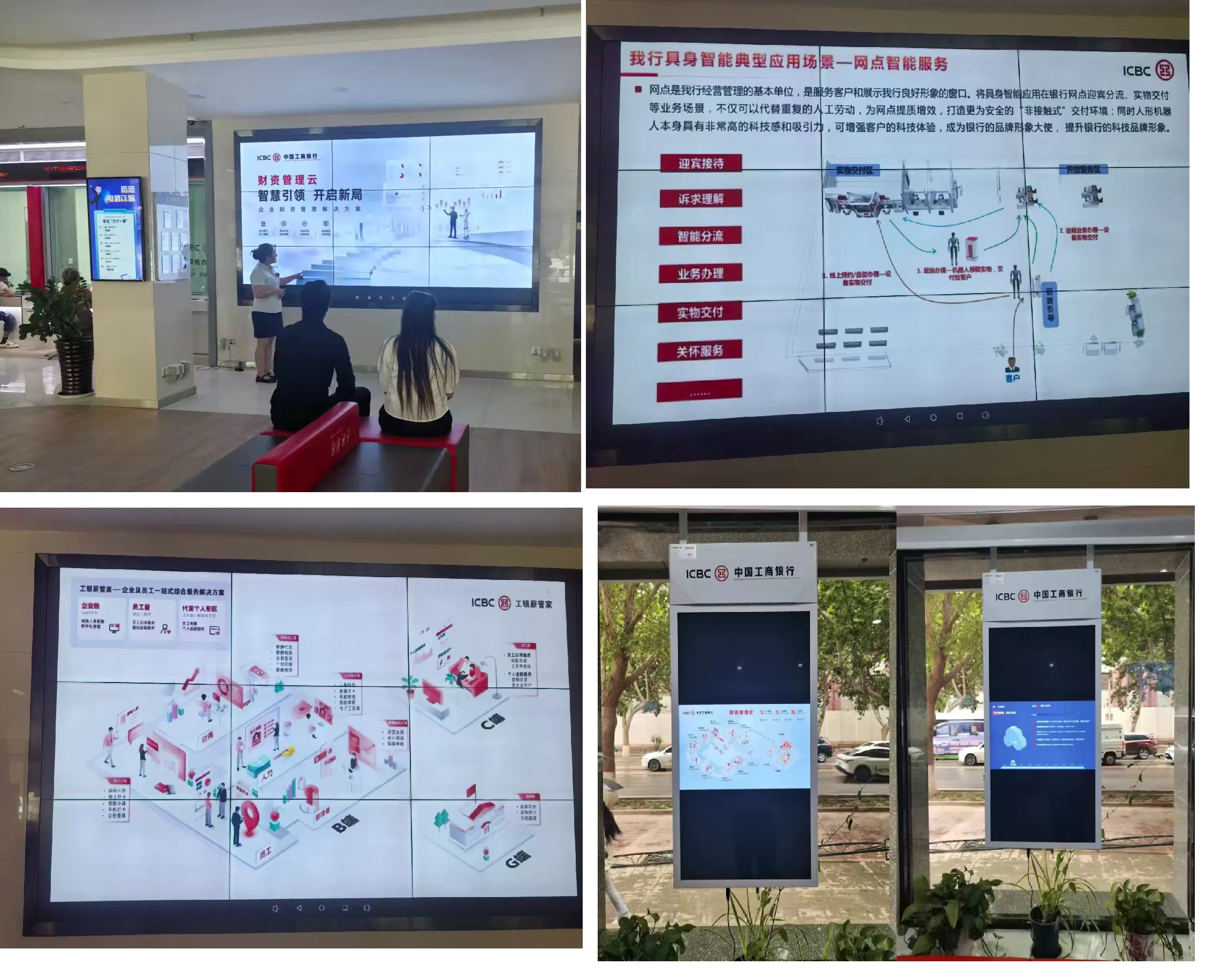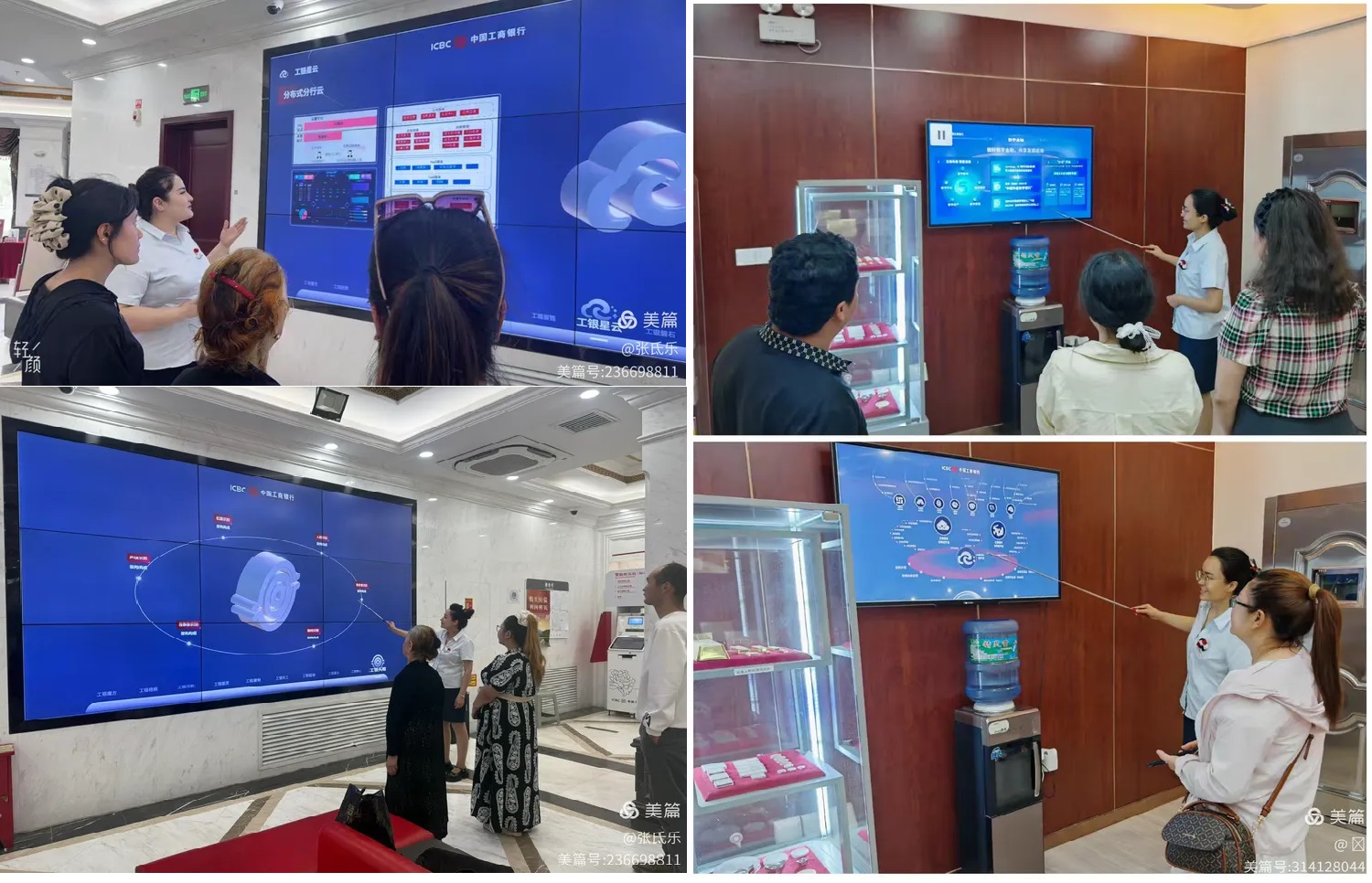 活动现场,支行通过大屏幕集中呈现多项金融科技服务内容。宽敞的营业大厅内,工作人员引导客户驻足观看,现场环境整洁有序,传递出专业服务的氛围。