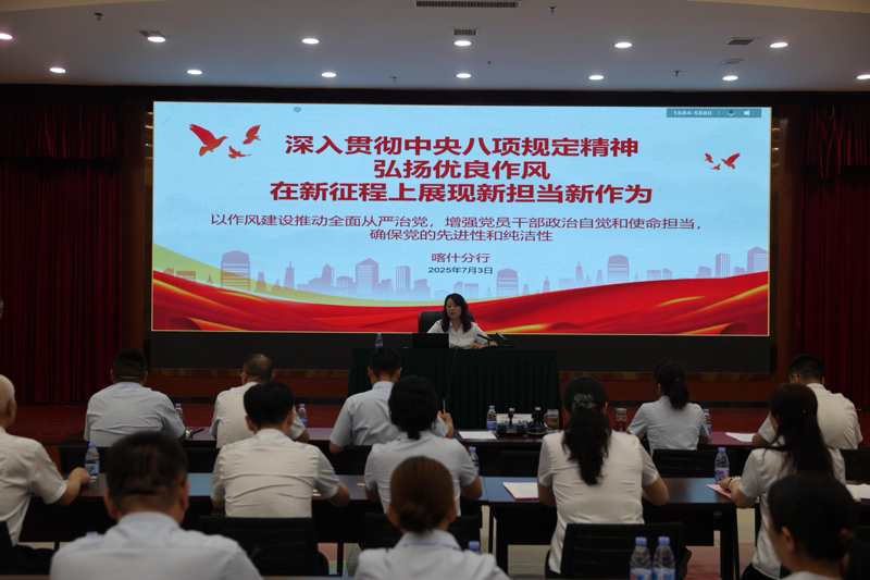 党委书记讲党课:工商银行喀什分行党委书记许娟,利用此次讲党课的机会,通报了该行中央八项规定学习教育的开展情况,并要求该行干部员工系统学习、对照检视、整改提升,全行对作风建设的重要性有了更深刻的认识。