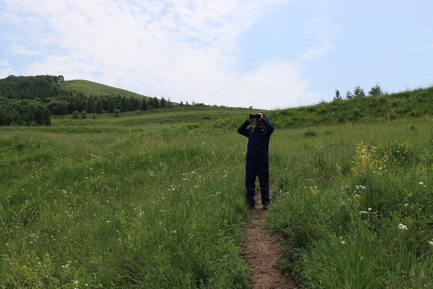 基地负责人王俊恒手持望远镜,观察山区野马活动情况。胡仁巴 摄