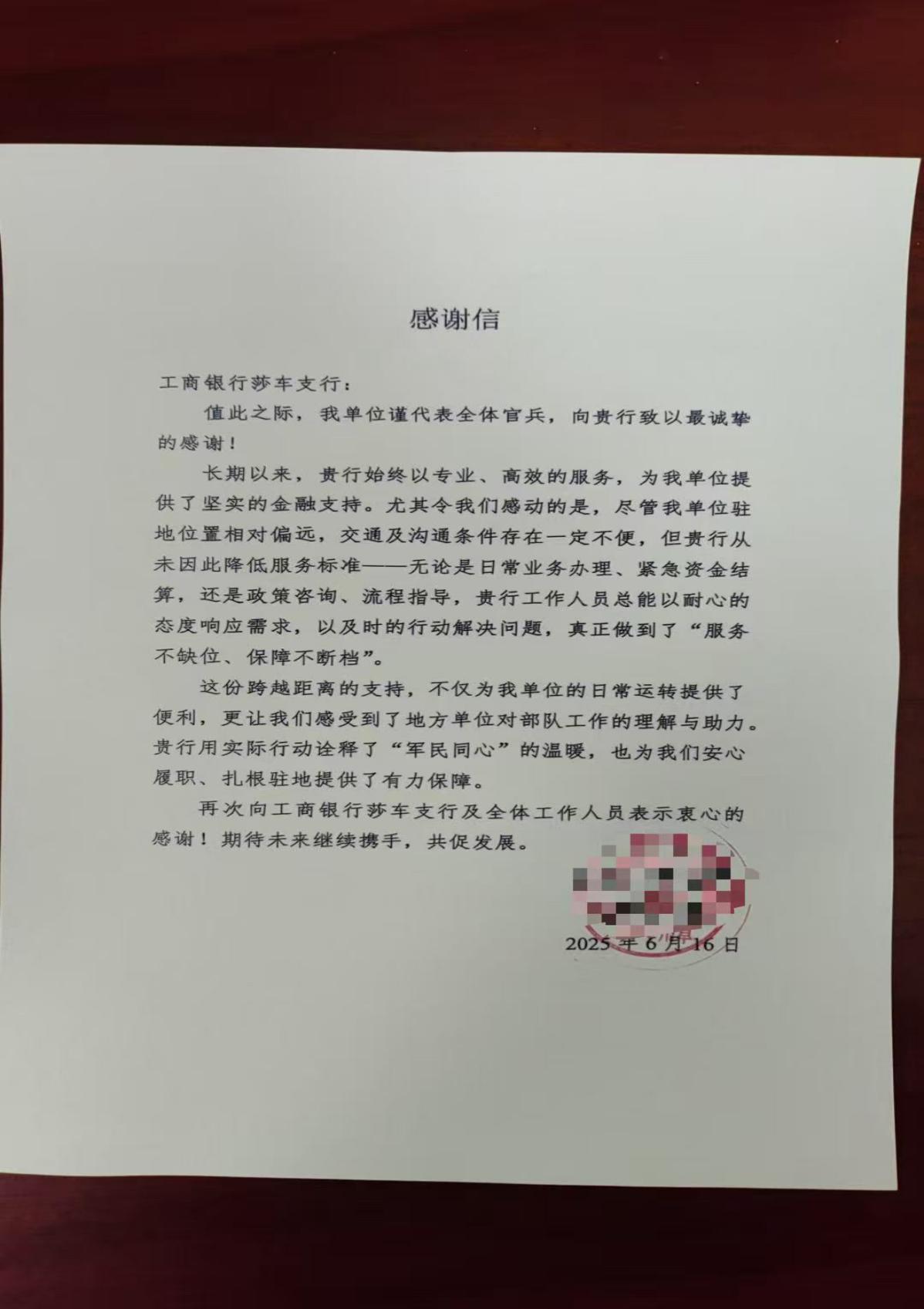 “两次上门不仅办好了公务卡,连对账难题都记在心上,这服务太到位了!”2025年6月,驻戈壁某部队领导紧握着工商银行莎车支行员工的手连声道谢。这份认可,源于该行用专业服务破解偏远驻地金融难题的实际行动。