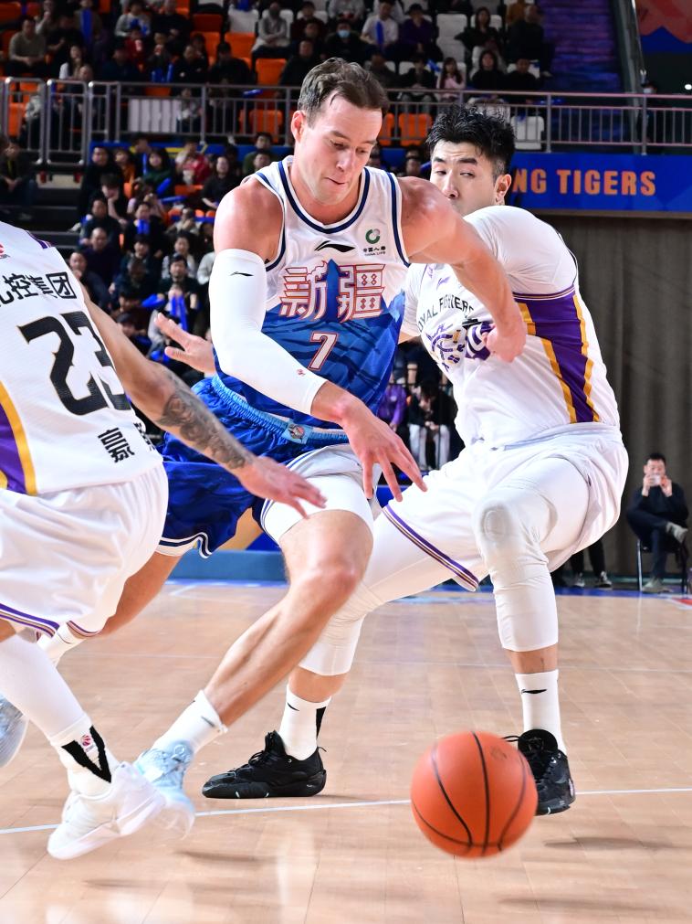 3月15日,新疆伊力特队球员纳托尔(右上)在比赛中传球。新华社发(徐锐摄)