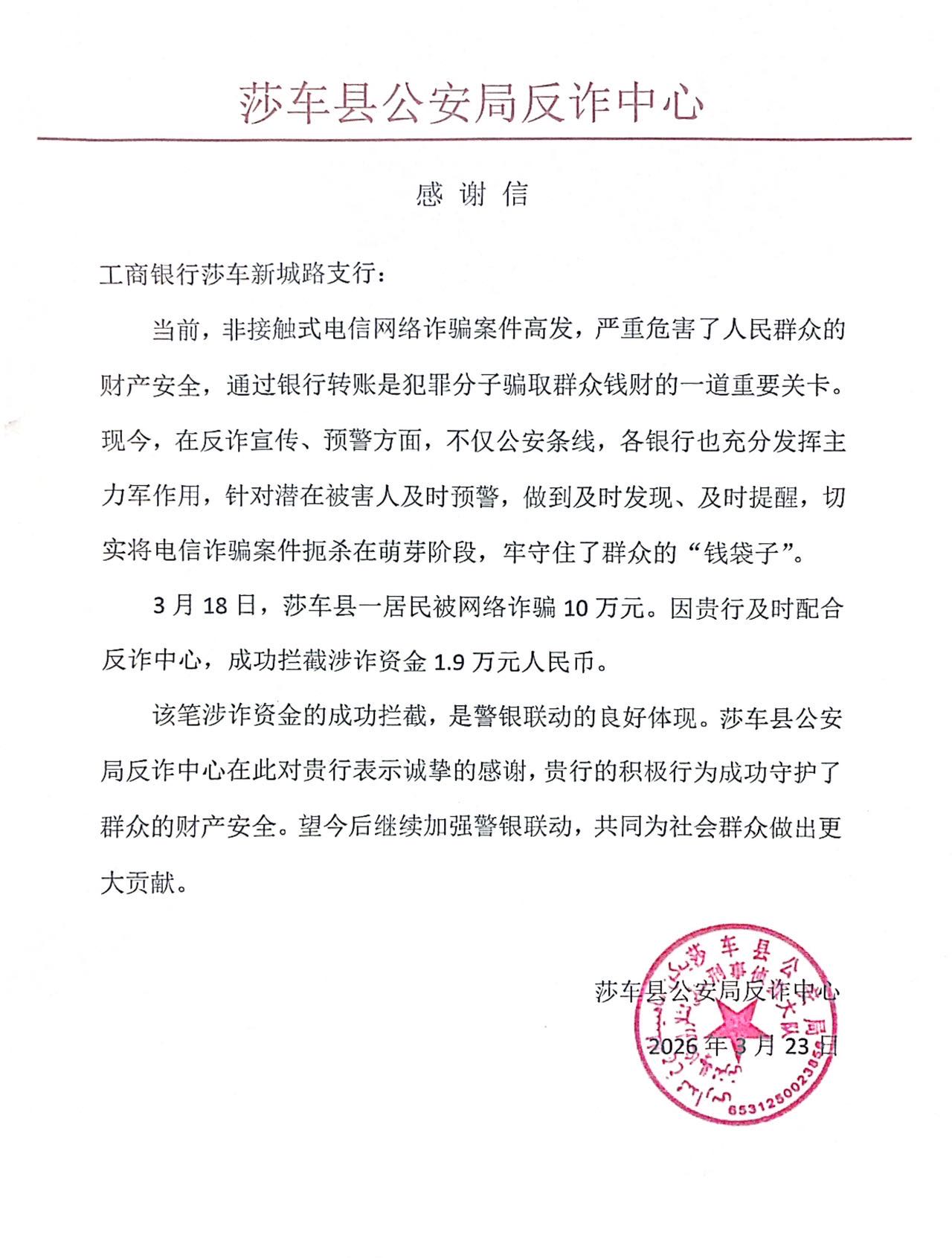 莎车县公安局反诈中心在感谢信中特别指出,银行是防范电信网络诈骗的重要关卡,工行莎车支行在本次事件中反应迅速、处置得力,其积极行动和专业素养充分体现了国有大行的社会责任担当与守护金融安全的坚定决心。