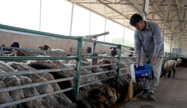 养殖户吐逊·阿合尼牙孜在喂羊(李哲清摄)