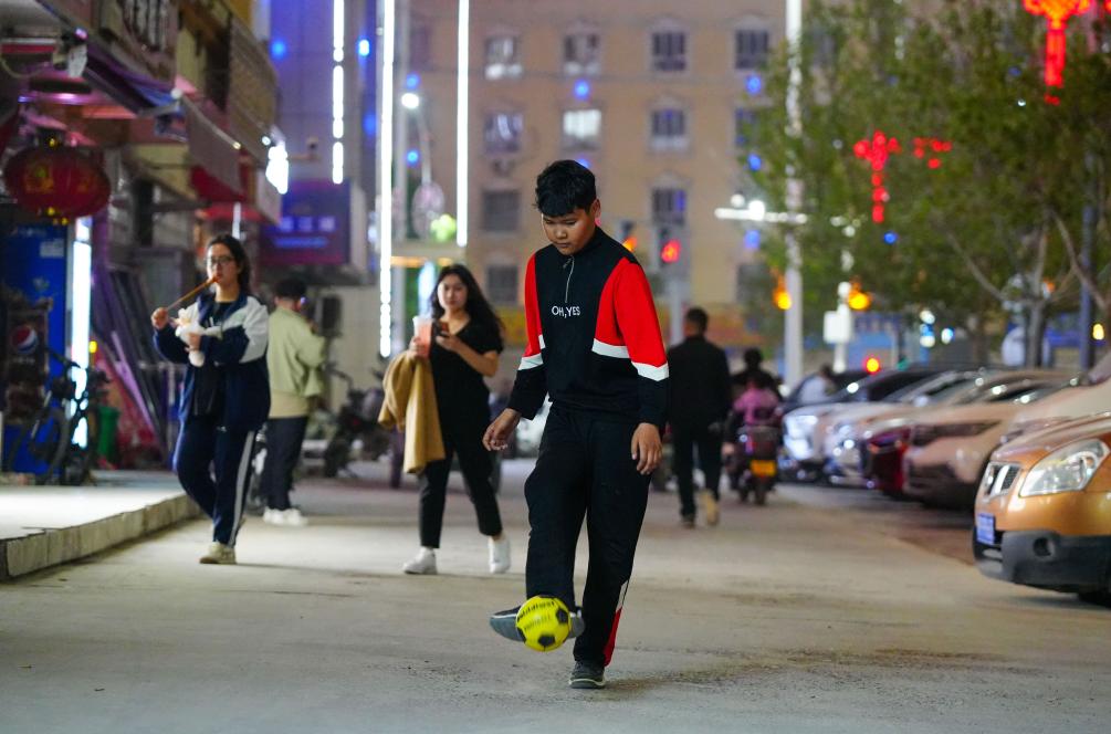 这是在新疆克孜勒苏柯尔克孜自治州阿图什市街头,一名青少年在玩足球(4月13日摄)。