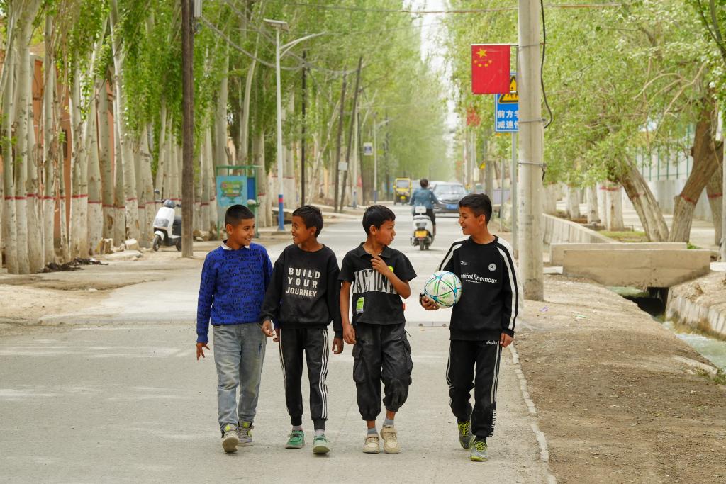 这是在新疆克孜勒苏柯尔克孜自治州阿图什市亚喀巴格村,小朋友们结束踢球后走在村中小路上(4月13日摄)。