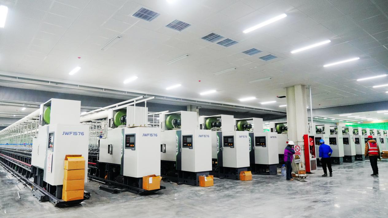 目前,一期40万锭棉纺项目已由两家承建单位同步推进设备安装与调试。项目大量采用行业领先的智能化、自动化设备,集成物联网、大数据分析等系统,可实现全流程自动化生产与精细管控。同时,项目秉承绿色低碳理念,所选设备在节能降耗、提升原料利用率等方面优势突出。张则军表示:“所有安装设备均达到国内先进水平,具有自动化程度高、高速高效、节能绿色及智能化等特点。”