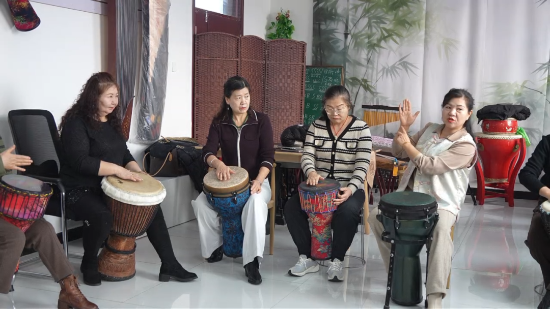 文艺爱好者刘宝英说:“第一次接触非洲鼓,感觉易学且节奏动听,希望结业时能独立演奏一首完整曲目。”