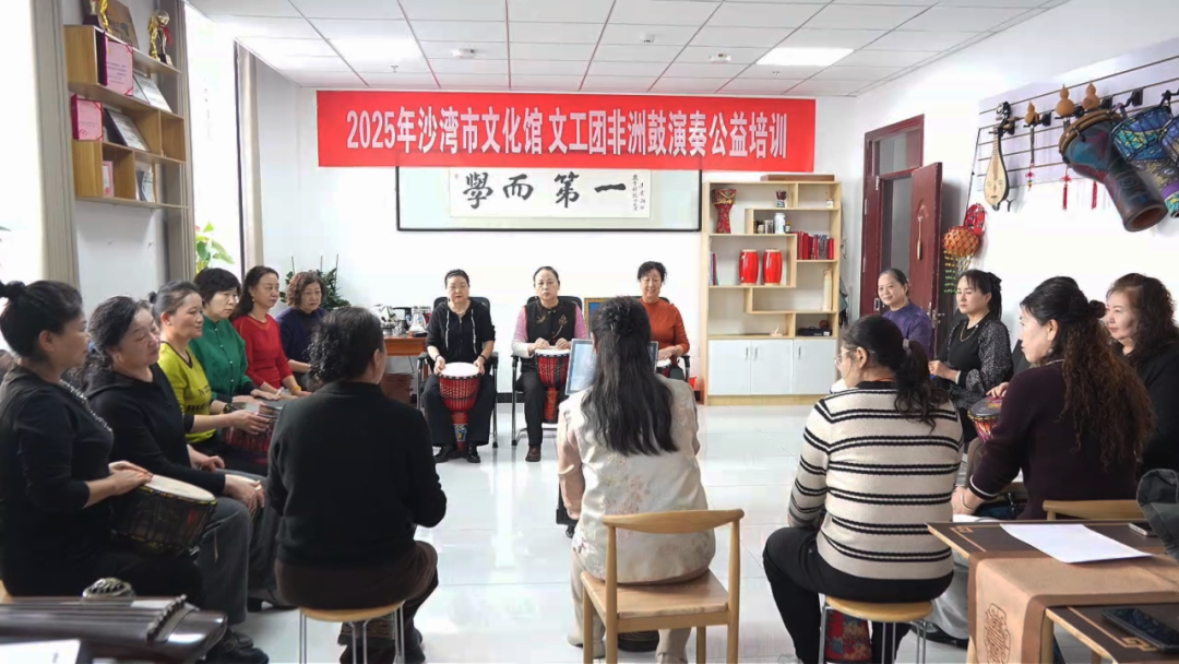 12月24日,沙湾市文化馆在书香街道城东社区日间照料中心开展“2025年非洲鼓演奏公益培训”,吸引十余名文艺爱好者参与。培训中,老师系统介绍非洲鼓的文化背景与演奏基础,带领学员进行节奏练习和配合训练,并逐一纠正动作与节拍,确保学员掌握要领。