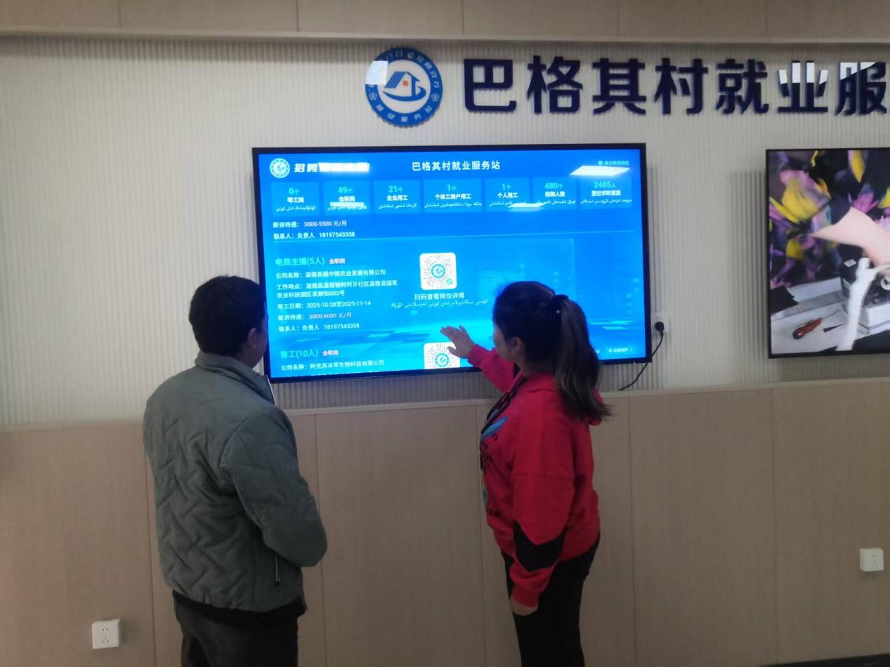 建强服务阵地,织密就业“保障网”。驻村工作队与村“两委”率先完成村级就业服务站标准化建设,配备招聘信息大屏、自助服务终端等设备。通过培训,村劳动保障协理员熟练操作各类服务平台,每日实时更新全村劳动力就业状态,推送就业信息、采集培训意愿,有力确保就业服务工作不断档、不掉线。通过开展“敲门行动”,驻村工作队队员和村干部深入村民家中,指导村民实名注册“e业阿克苏”微信小程序,帮助群众完成求职意愿登记、培训意愿填报和就业岗位查找。截至目前,已帮助全村957名劳动力实名注册“e业阿克苏”微信小程序,劳动力实名注册率达96.5%。
