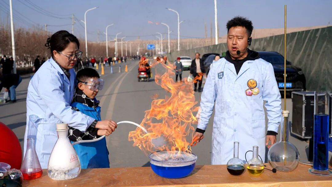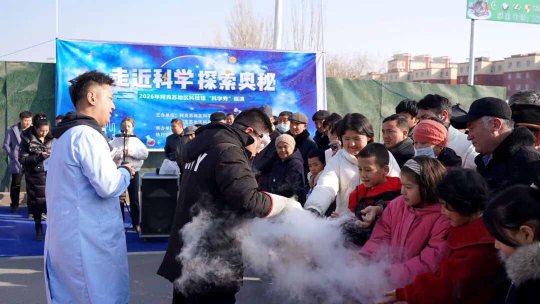 1月10日,“‘空气’科学秀?解锁看不见的力量”主题科普活动在温宿大巴扎精彩举办,科普工作者向群主演示各类科学实验(阿依努尔·阿布都外力 摄)