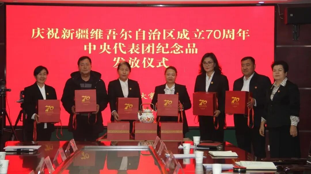 近日,新和县人大常委会举行庆祝新疆维吾尔自治区成立70周年中央代表团纪念品发放仪式,将党中央的关怀与问候精准传递到基层人大代表的心中。