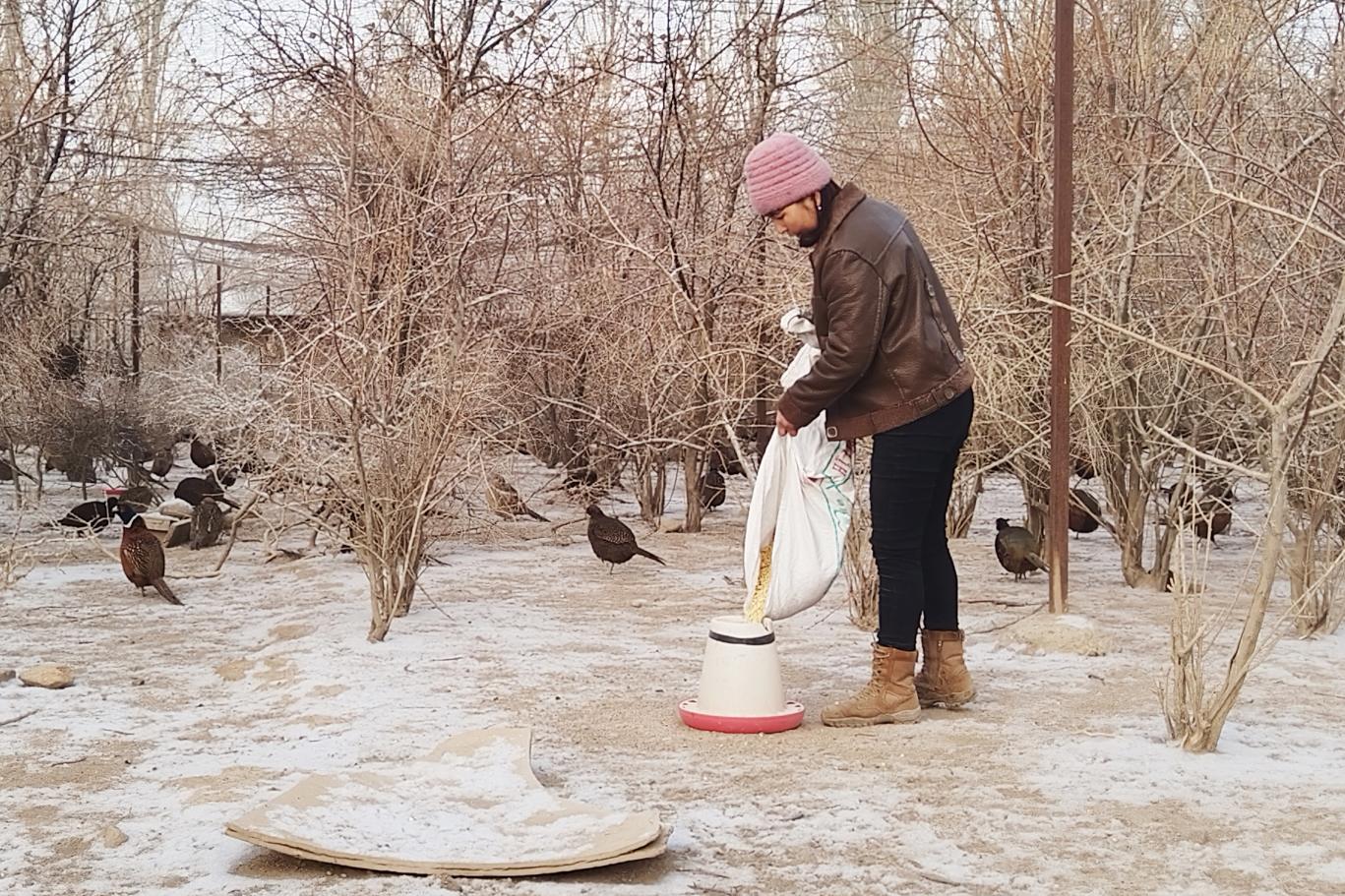 温宿县柯柯牙镇帕克勒克村村民给七彩山鸡投喂饲料(赵嫣然 摄)