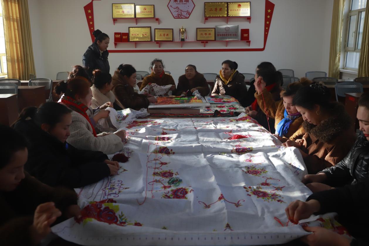 传统手工艺传承人月尔古丽·赛买提老师指导学员们刺绣。(张浩 摄)