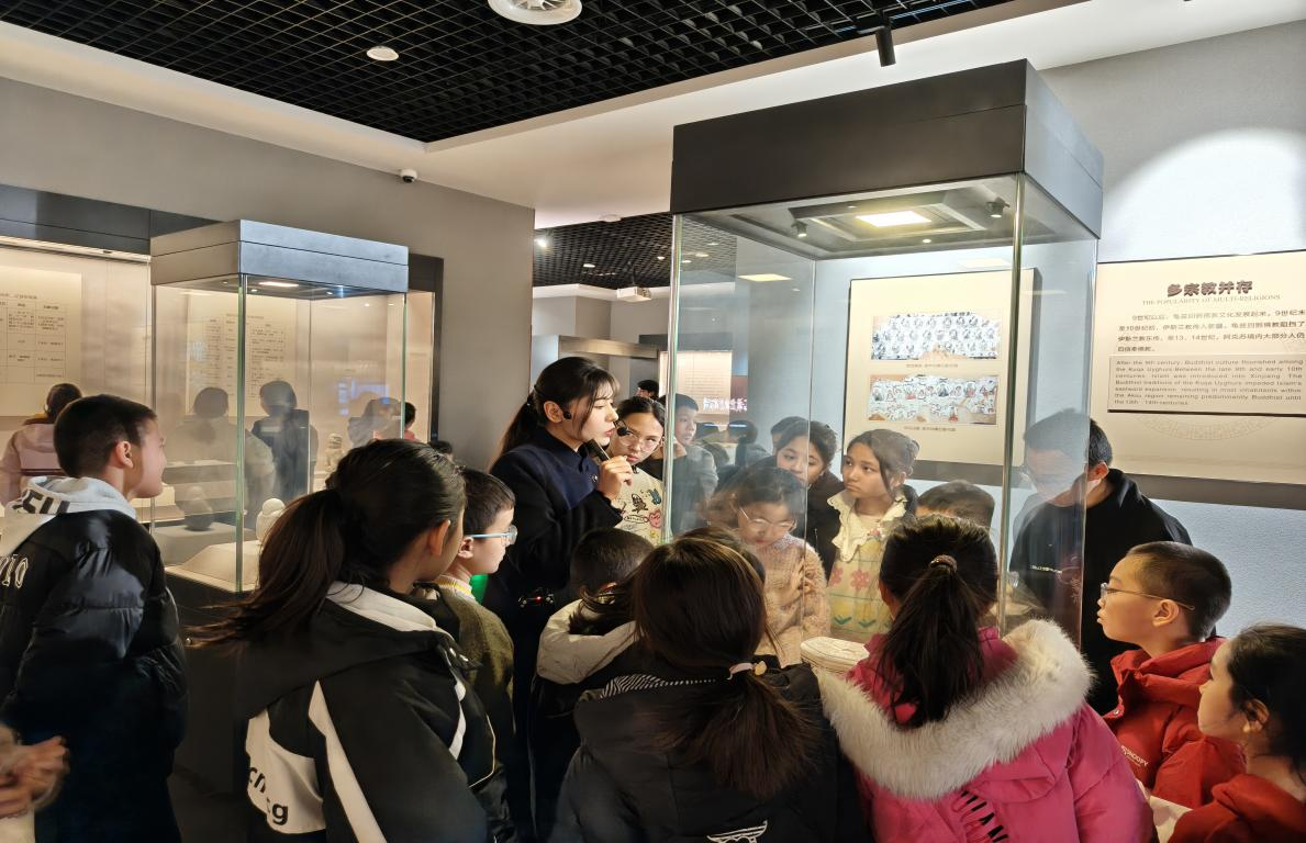 走进阿克苏地区博物馆,这座融汉唐风韵的建筑静立多浪河畔,巨幅手绘瓷板壁画《飞天》率先映入眼帘,瞬间将孩子们带入历史长河。“哇,这幅画好漂亮!古人的想象力太丰富了!”少先队员张宇辰轻声赞叹。