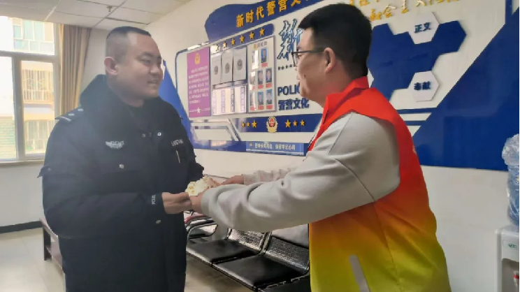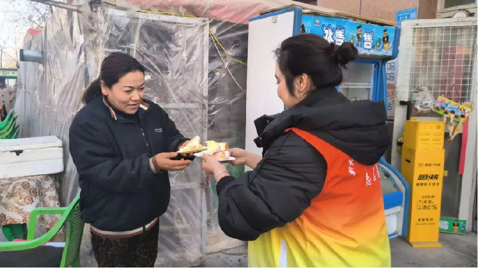 活动现场暖意融融,社区工作人员与七色花志愿服务队志愿者组成慰问小分队,带着精心准备的新春蛋糕,先后前往辖区警务站、医务室及沿街商铺开展慰问。在警务站和医务室,志愿者们与坚守岗位的警务人员、医务工作者亲切交谈,向他们致以诚挚的感谢和新春的祝福,感谢他们一年来默默坚守、无私奉献,用坚守守护辖区平安、用坚守守护居民健康。在沿街商铺,志愿者们与商户经营者促膝谈心、共话新春,细致询问经营近况,倾听商户诉求,送上节日的美好祝愿。当香甜的蛋糕送到大家手中,每个人的脸上都洋溢着幸福的笑容,一句句真诚的感谢、一声声温馨的祝福,让现场氛围愈发浓厚,甜蜜的滋味在彼此心间传递,暖意融融。