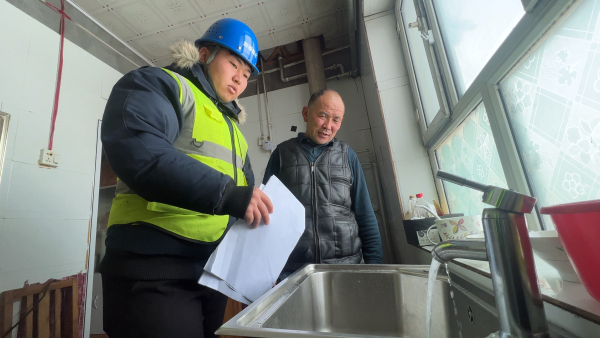 沙湾市思源水务有限公司工作人员在西戈壁镇五道沟村开展入户走访查看水量水质。特来克·木哈买提江摄