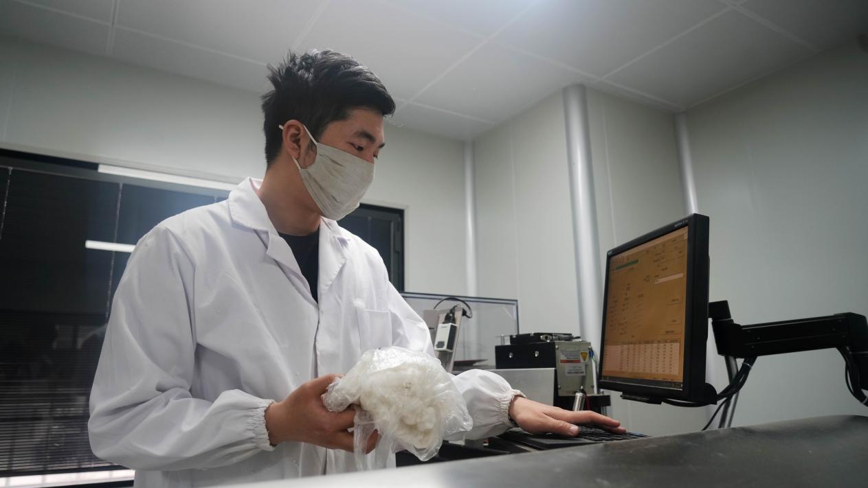 新疆金丰源种业有限公司测试中心技术员杨龙龙在检测棉花纤维长度、强度、马克隆值情况(赵新昌 摄)