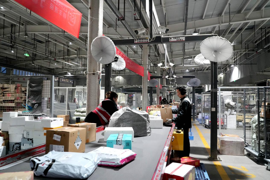 在新疆顺丰速运有限公司阿克苏分公司转运中心,工作人员正在加班加点分拣包裹(赵新昌 摄)