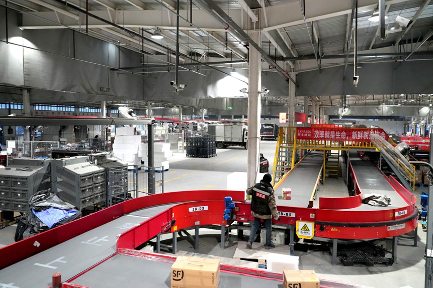 2月12日,快递车抵达新疆顺丰速运有限公司阿克苏分公司转运中心(赵新昌 摄)
