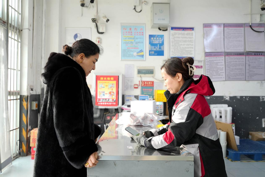 在新疆顺丰速运有限公司阿克苏分公司温宿县营业点,营业员陈东莲在前台处理客户的快递(赵新昌 摄)