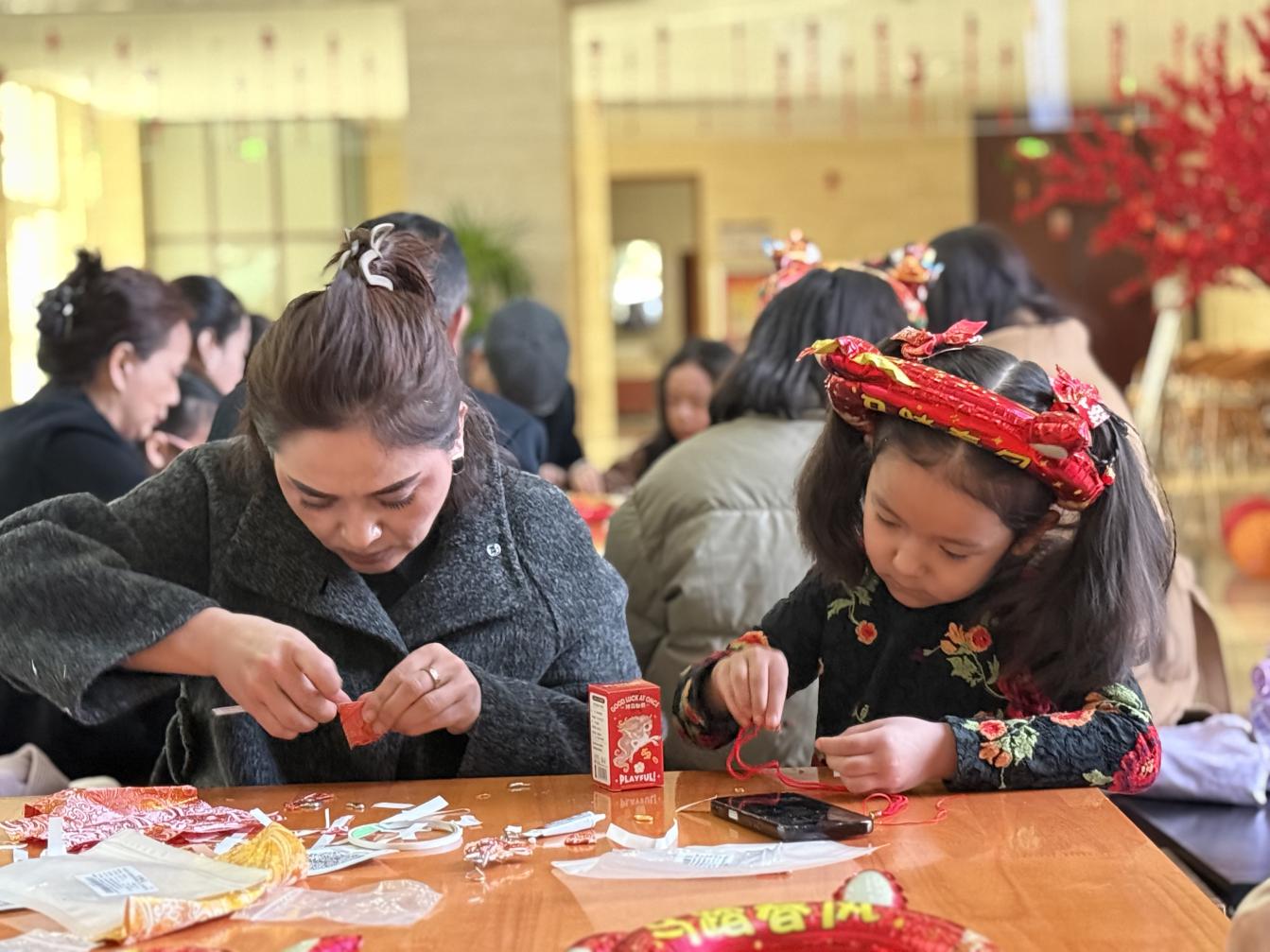 图为家长和孩子们正在做手工。刘白玉 摄