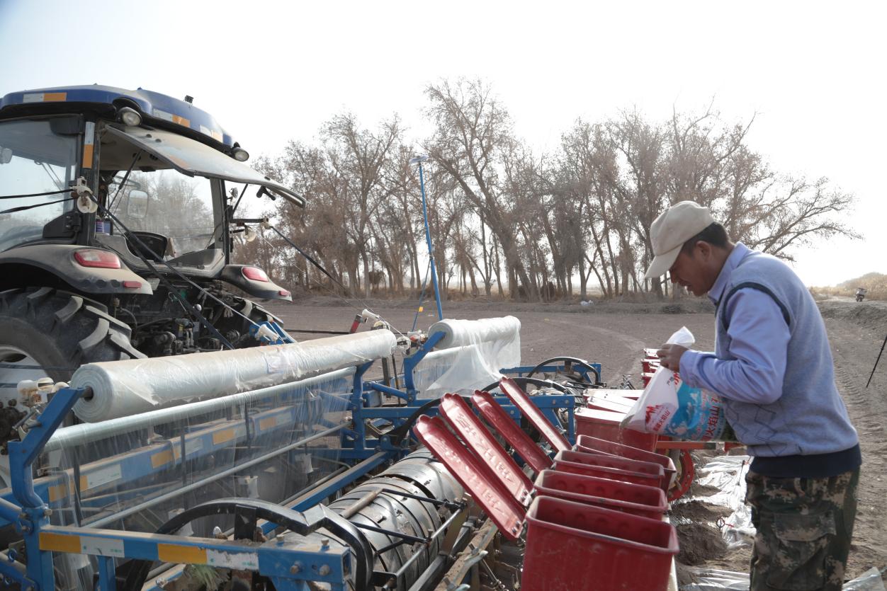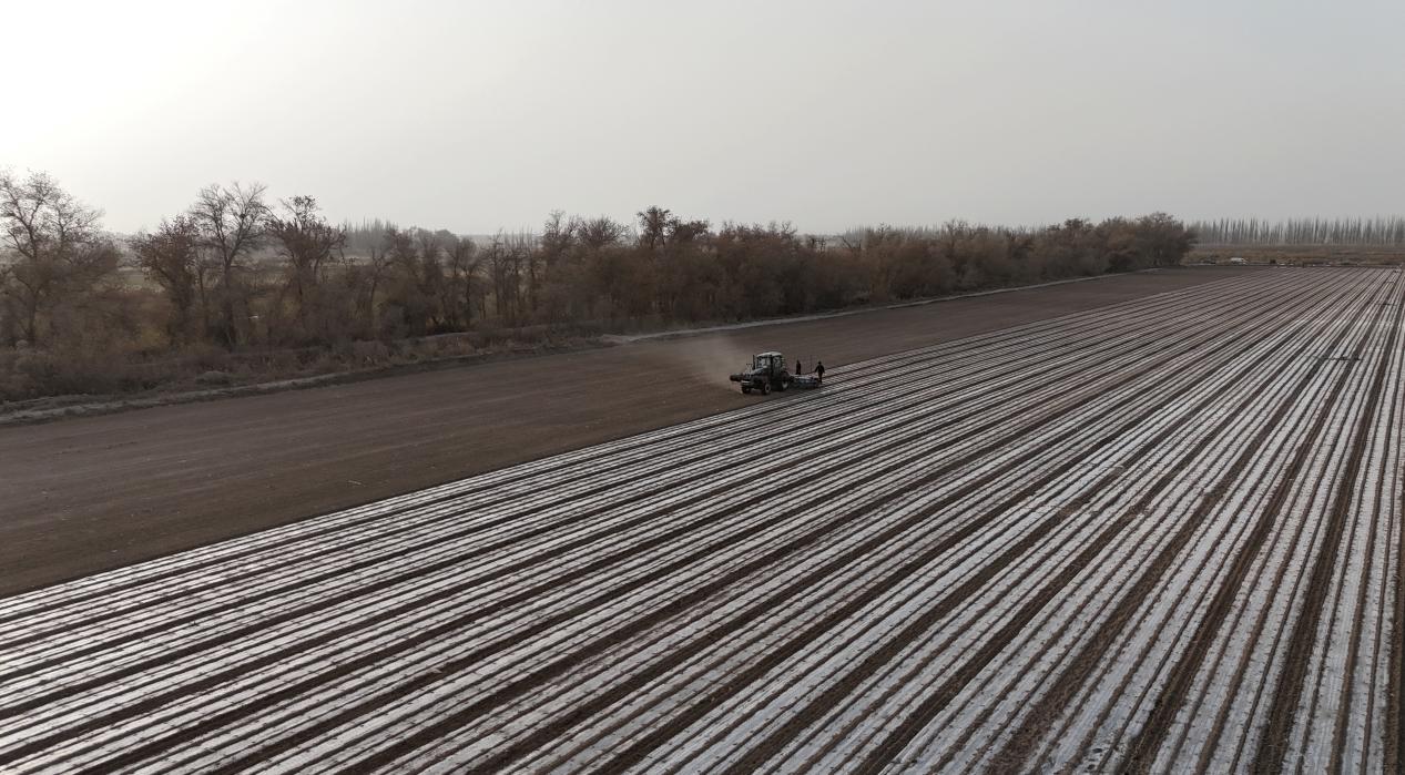 在一团金银川镇三连田间,孜然播种工作有序进行。朱志升 摄