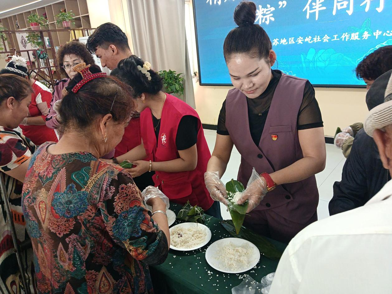 温宿县温宿镇民生社区干部买丽克扎提·牙生和居民一起包粽子过端午(陈为康 摄)