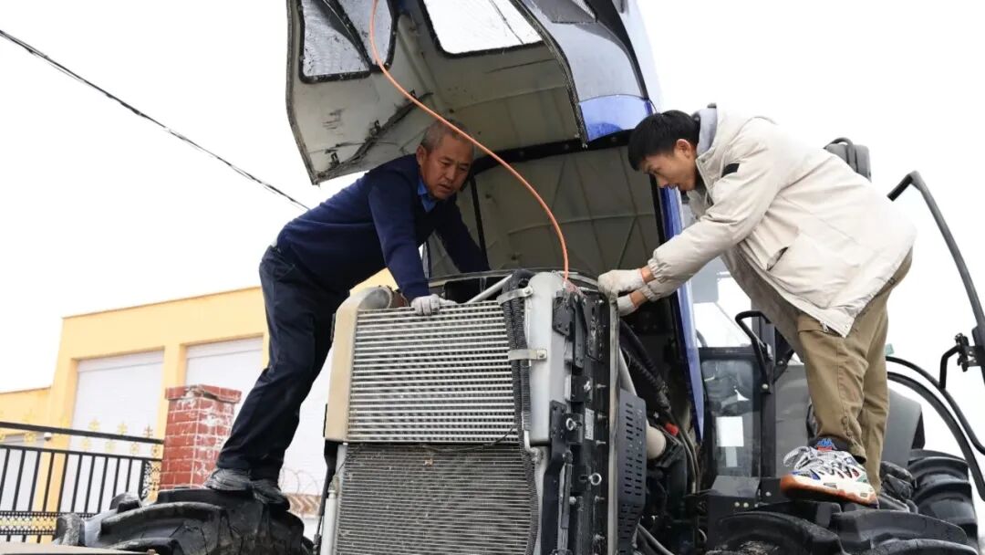 3月10日,在沙湾市金沟河镇宋圣宫村,农机户陈建国正在镇农业发展服务中心技术人员的指导下进行农机检修保养,排查安全隐患,为接下来的春耕生产做好准备。