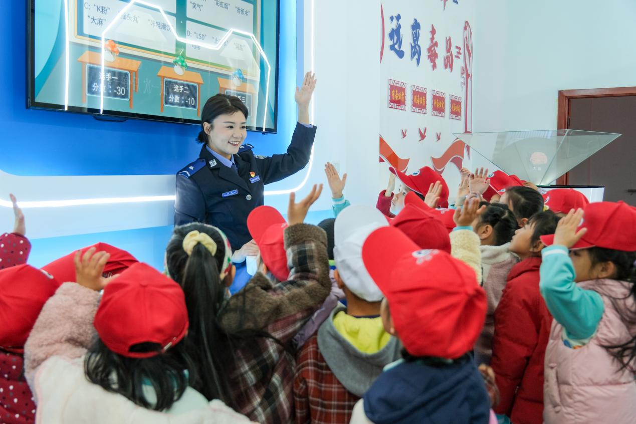 在警察叔叔的引导下,活动以“视听+体验+互动”的立体化模式展开。孩子们首先驻足于巨大的电子屏幕前,观看了禁毒宣传教育片。影片中,原本鲜活的生命因毒品而凋零的画面,让喧闹的展厅瞬间安静下来,孩子们的眼神中流露出震惊与惋惜。