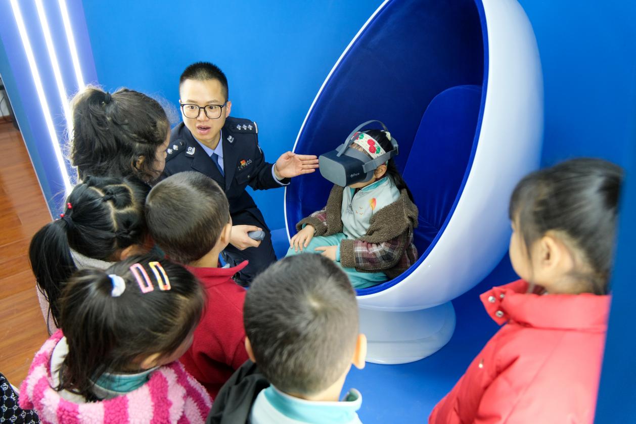 小朋友在民警的引导下,在温宿县禁毒教育基地通过体验VR技术,了解毒品危害以及相关知识。(杨鸿健 摄)