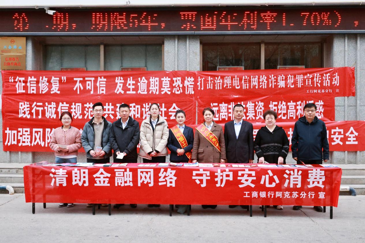 在春风送暖,护权先行。2026年3月13日,工商银行阿克苏分行紧扣“清朗金融网络 守护安心消费”主题,以“3·15国际消费者权益日”为契机,在辖内营业网点门前开展集中宣传活动,聚焦金融消费者权益保护、征信知识、电信诈骗防范、反洗钱等重点领域,通过“线下设点+线上互动+适老服务”多维联动,为群众筑起金融安全“防护墙”,让金融服务更有温度。